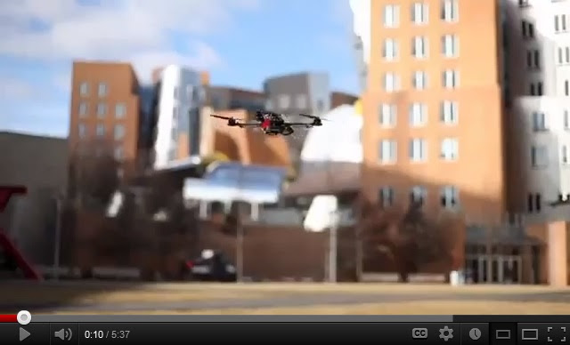 هذه مروحية رباعية يطلق عليها رباعية لأنها تحوي أربعة محركات تدور فتولد قوة الدفع هذا الطيار الذي يتحكم بالمروحية عن طريق مرسل موجات راديو إنه إختراع بارع ومنظم .. ولكن لنأخذ رحلة صغيرة عبر الشارع بالطبع سوف ننظر في كلا الجهتين قبل عبور الطريق وصلنا إلى هذا المكان حيث يمكن للمروحية الرباعية الإقلاع بنفسها دون أي مساعدة بشرية نحن لا نحتاج للطيار يمكن لهذا الروبوت الطائر الإقلاع بدقة متناهية في الاماكن الصغيرة المغلقة انه يستطيع القيام بمناورات منظمة ومتناهية الدقة أيضاً وإن كنت تسئل نفسك عن كيفية تحليق هذا الروبوت فأنت في المكان المناسب لذلك روبوتات التحليق في الأماكن المغلقة فصل التحطيم حسناً ربما " فصل " التحطم ليس المصطلح الأنسب روبوتات التحليق في الأماكن المغلقة تجربة تعليمية عاجلة لمعرفة كيفية تحليق الروبوتات علينا أولاً أن نفهم الفيزياء الاساسية للمروحية الرباعية كيف يمكن للبشر التحكم في تلك المروحيات وكيف يمكننا أن نجعل الحاسوب يقوم بذات الأمر وكيف يمكن جراء ذلك أن نستخدم الروبوتات للقيام بمناورات معقدة بداية دعونا ننظر إلى الفيزياء الحاكمة لتلك الروبوتات وكيف يمكن للمروحية الرباعية التحليق عندما تدور المراوح فإنها تدفع الهواء أسفلها وتبعاً لقانون نيوتن الثالث .. والذي ينص على أن لكل فعل رد فعل مساو له ويعاكسه في المنحى فإن رد الفعل نتاج حركة المرواح سوف يولد قوى رفع تعادل وتكافىء قوى الجذب التي تجذب المروحية الرباعية مما يدفعها للتحليق ولكي تميل المروحية جانباً على إحدى المراوح أن تدور أسرع من الأخرى المعاكسة لها بمقدار بسيط وهذا سوف يولد قوى دفع أفقية بالاضافة الى تلك المتولدة اساساً والتي تكون عكس الجاذبية مما يدفع المروحية للتحرك في الإتجاه الذي نريده وهذا أمر رائع .. ولكنه لا يرينا كيف يمكن للمروحية الرباعية من الدوران حول المحور الشاقولي لقد تبين أن قانون نيوتن الثالث ايضاً ينطبق على القوى الدورانية التي تدعى عزم الفتل عندما تدور مروحتان فإنهما تشكلان عزم فتل للهواء وعليه سوف ينتج في الاتجاه المعاكس رد فعل موازي لعزم الفتل ذاك مما يدفع المروحية للدوران بالاتجاه المعاكس بينما تكون المروحتان الأخرتان تدوان في إتجاه آخر لكي تولد عزم فتل آخر مما يدفع المروحية للدوران عكس عقارب الساعة وعندما تعمل المروحيات الاربع لكي تولد قوة دورانية وعزم فتل فان المروحية ترتفع وذلك بسبب عزم الفتل المتساوي تجاه جميع الاتجاهات واثناء التحليق يمكن تغير الاتجاه عندما تدور مروحتان بسرعة بسيطة اكبر من المروحتان الآخرتان وهذه هي الفيزياء الاساسية التي تتحكم بطيران المروحية الرباعية ولكن قبل ان ننتقل الى التحكم المؤتمت التام بالمروحية الرباعية علينا أن نعرف كيف يمكن للإنسان التحكم و التحليق بها يجب ان نقوم بتجزئة تلك العملية لأربع خطوات اساسية الاولى هي حين يقوم الطيار بواسطة نظره بمراقبة المروحية وكيف يستطيع ادارك اي اتجاه تتحرك صوبه وفي هذا المثال الطيران يرى المروحية الرباعية تسقط نحو الارض و من ثم على الطيار أن يقرر ما هي الاوامر التي يريد أن يرسلها للمروحية في هذه الحالة قرر الطيار إيقاف المروحية عن الهبوط وعليه يجب ان يريد من سرعة دوارن المراوح الاربعة ولكي يخبر المروحية الرباعية ما يريده وما قرره يستخدم الطيار مرسل موجات راديو وهو عبارة عن جهاز تحكم مميز ومن ثم تستقبل المروحية الرباعية الاوامر المرسلة عبر موجات الراديو وتقوم بتعديل سرعة كل مروحة لديها والان لنرى ما الذي يتوجب تغيره من كل البنود الاربعة السابقة لكي نجعل المروحية الرباعية مؤتمتة التحكم بداية في الخطوة الاولى .. قمنا بتخصيص كميرة مراقبة متخصصة لكي نستعيض عن عين الطيار وهذه الكميرة تقوم باشعاع ضوء باشعة التحت حمراء والتي ترتد عن اماكن محددة على المروحية ومن ثم تعود الى الكميرا ويمكن لكميرا جانبية ان تحدد بعد تلك المروحية في الاتجاه الشاقولي واحد الاتجاهات الافقية ويمكن لكميرا 